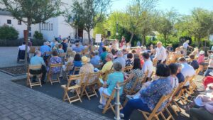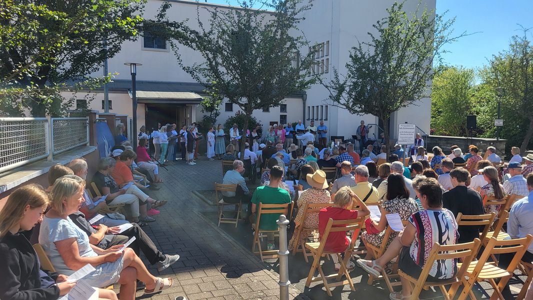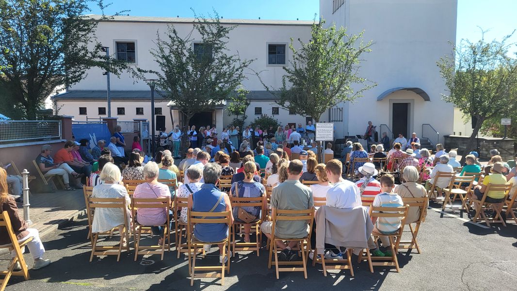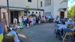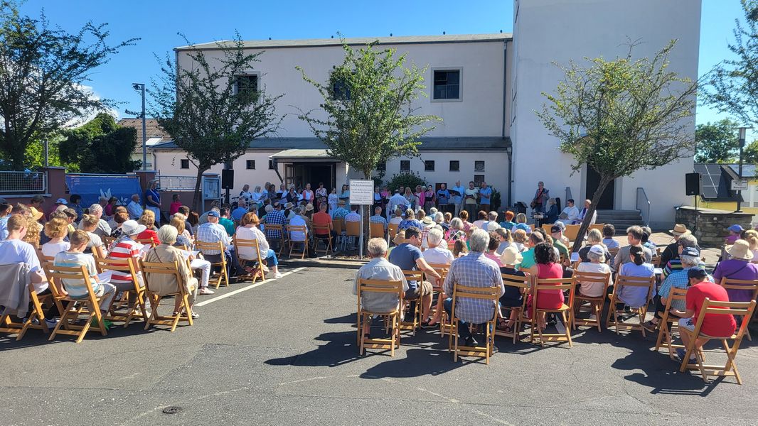 Es ist fast schon Tradition, dass der Gospelchor den ökumenischen Gottesdienst zum Niederhöchstädter Markt mitgestaltet, so also auch in diesem Jahr. Tradition ist auch, dass das Wetter mitspielt und wir uns wieder bei strahlendem Sonnenschein vor der Nikolauskirche zu einem open-air-Gottesdienst versammeln konnten. Cathrin Lerch von katholischer und Kai Scheunemanns von evangelischer Seite hatten den Gottesdienst inhaltlich vorbereitet und geleitet. Der Gottesdienst stand von Anfang unter dem Zeichen des Miteinanders, im Wechselgesang bzw. im wechselseitigen Gebet. Der Chor zog mit dem fröhlich auffordernden „Masithi“ (südafrik.) Lobpreis ein und gleich im Anschluss sangen sich Männer und Frauen gegenseitig zu: „Gehet nicht auf in den Sorgen dieser Welt“. Welch schönes Motto mit dem dazugehörigen Halleluja für dieses Festwochenende. Im Anschluss wurde nach dem Psalm 9 ebenfalls im Wechsel gebetet. Der Chor folgte mit dem inständigen Appell: „Make love not war“ – wie nötig in Zeiten wie diesen. Zu dem Evangelium, wo Jesus fragte, „wer denn seine Familie sei“ und er antwortete: „Alle, die den Willen Gottes tun“ (Mt 12,46ff) führte dann Kai Scheunemann in seiner Predigt den Gedanken von einer wahren allumfassenden Gemeinschaft weiter aus. Bestätigt wurde dies vom „Selig seid ihr“ des Chores und der ökumenischen Besucher. Eine ausführliche Meditation – Fürbitten – Vaterunser verbinden den Gemeinschaftsgedanken, der durch den Austausch von Ökumene-Kerzen verdeutlicht wurde. Ein sehr schöner Gedanke, weil auch der weltlichen Gemeinde in Person des Bürgermeisters Shaikh eine Kerze übergeben wurde.